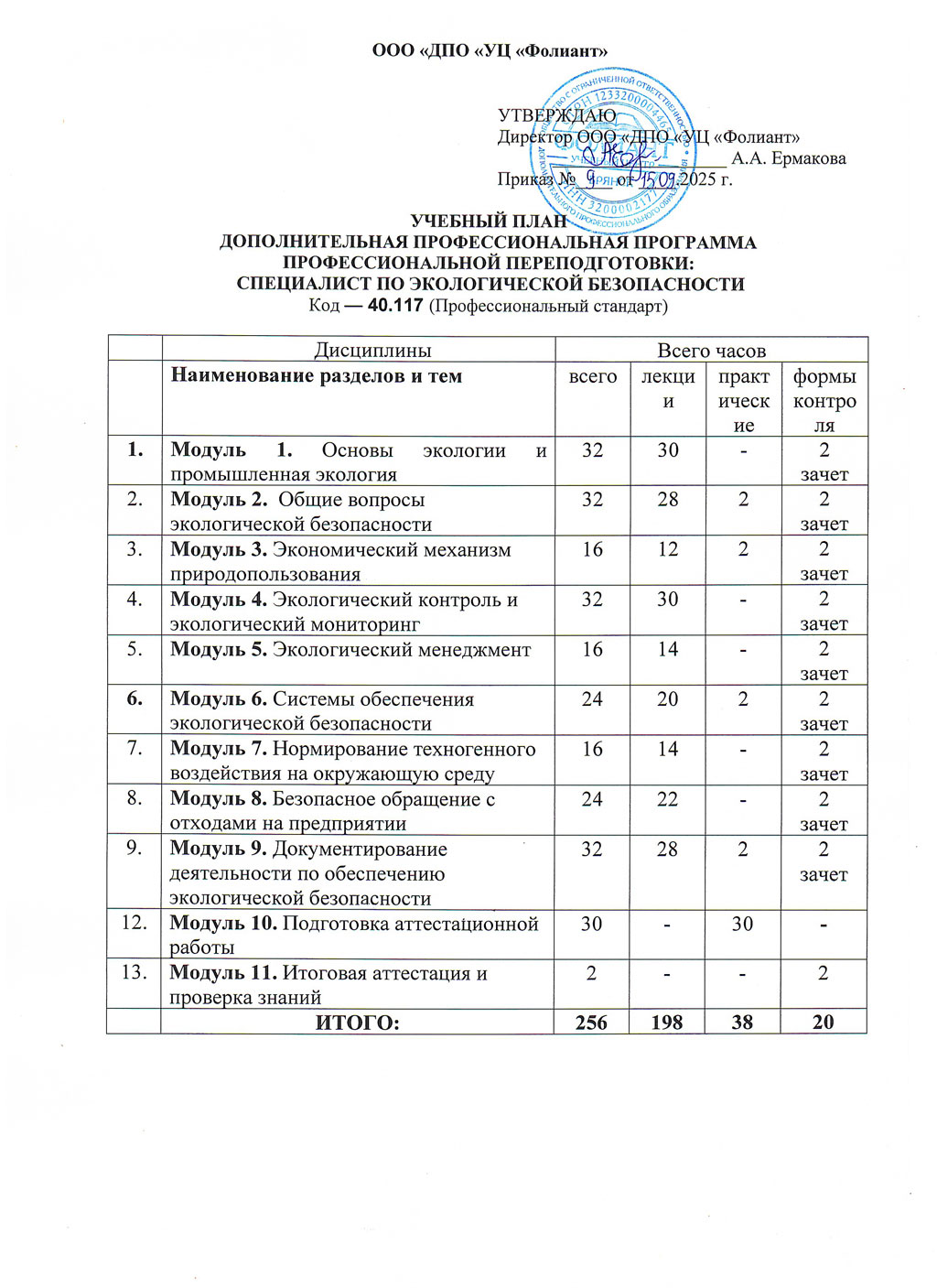 Цель: Целью реализации программы является получение слушателями теоретических знаний, необходимых для выполнения нового вида профессиональной деятельности в области экологии, экологической безопасности и охраны окружающей среды, приобретение новой квалификации: специалист в области экологической безопасности.