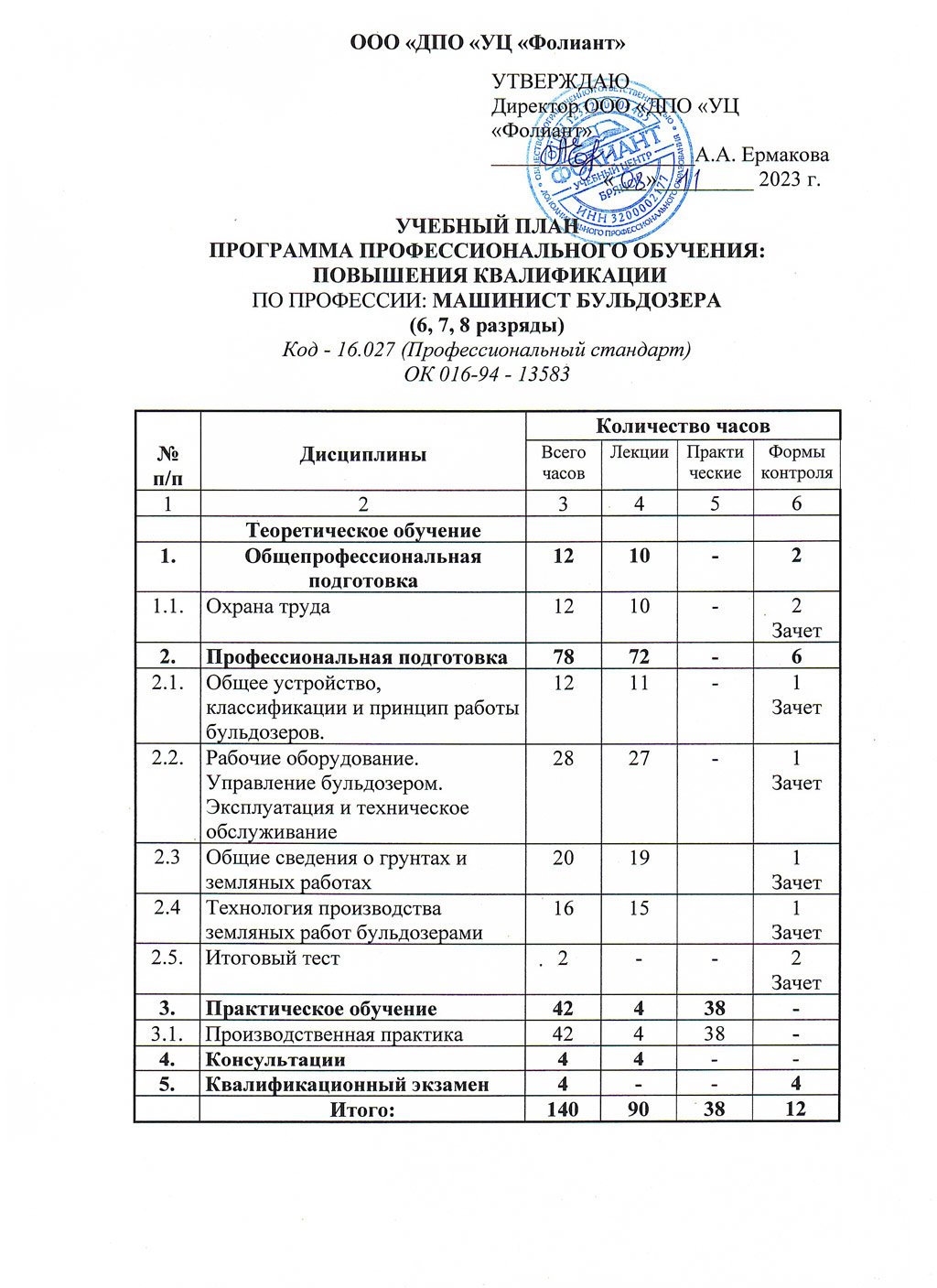 Цель: сформировать у слушателей конкретные профессиональные компетенции, необходимые для применения в практической деятельности по профессии «Машинист бульдозера» и сформировать готовность к успешной деятельности на рынке труда, трудоустройству.