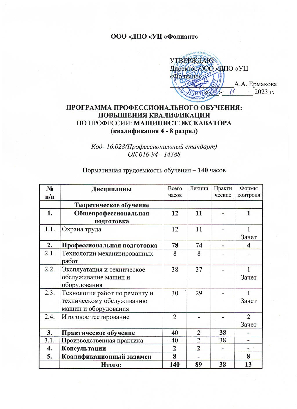 Цель: сформировать у слушателей конкретные профессиональные знания и навыки, необходимые для применения в практической деятельности по профессии «Машинист экскаватора» 4 разряда и сформировать готовность к успешной деятельности на рынке труда, трудоустройству.