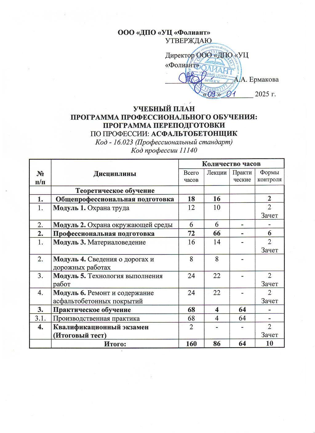 Слушателям, успешно освоившим программу и прошедшим итоговую аттестацию, выдается Свидетельство установленного образца о профессиональной переподготовке по профессии «Асфальтобетонщик», копия протокола заседания квалификационной комиссии.