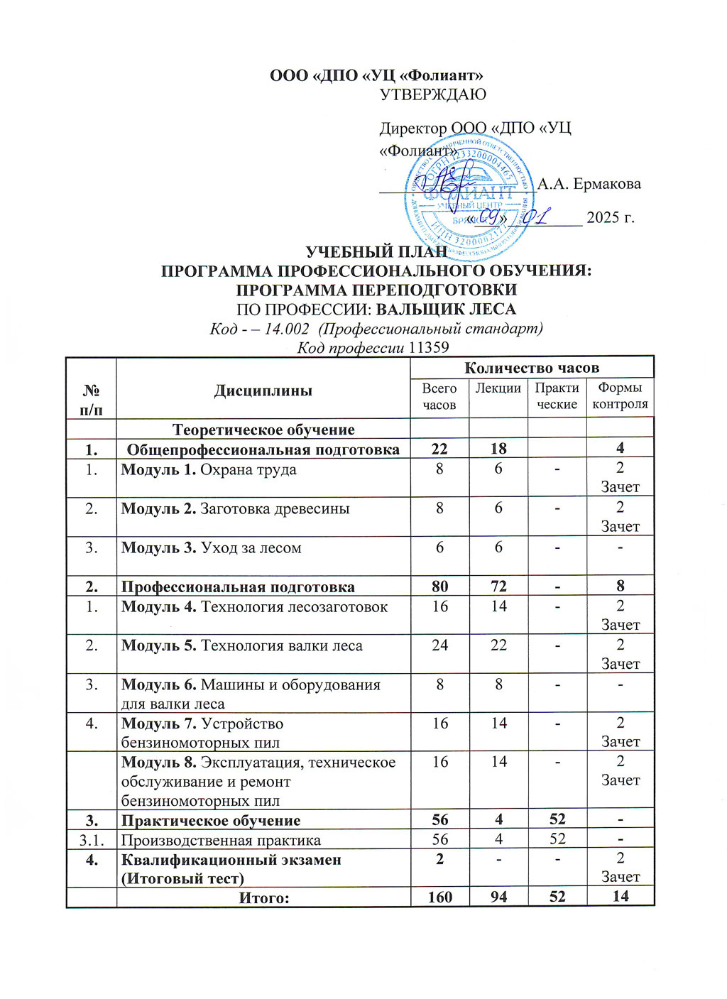 Цель: Целью реализации программы является формирование у слушателей профессиональных компетенций, необходимых для профессиональной деятельности, изучение устройства оборудования и технологии выполнения работ, приобретение знаний, умений и навыков безопасного выполнения работ в объеме требований к квалификации "Вальщик леса».
