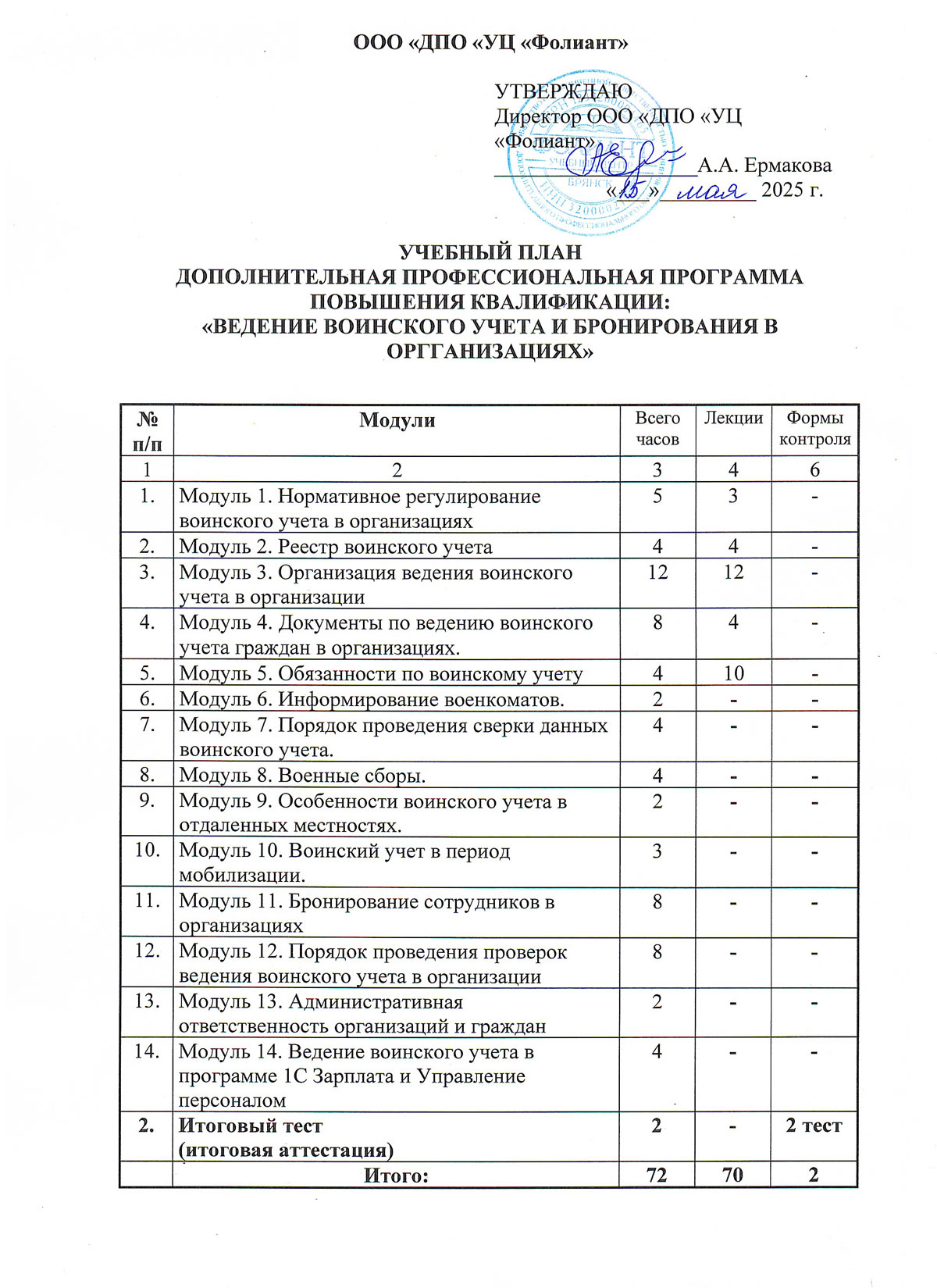 - практическая подготовка для выполнения работ по ведению документооборота при ведении общего воинского учета в организации.
